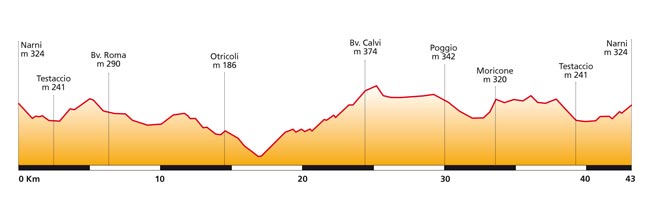 The starting point is the Rocca Albornoz, an ancient outpost built midway through the 14th century at the very highest part of the spur on which the town was constructed. From here, you descend towards the centre of Narni and then turn left towards Testaccio, a small village 2.5 km. further on. Carry on in the direction of Rome until you get to the junction with the SS3 (km. 6.5), and then turn left in the direction of Rome once again. Carry on along this undulating section of road until you get to km. 14, where you turn left towards the ancient town of Otricoli, famous for the archaeological zone of Ocricolum, the Roman town that arose along the Tiber in the vicinity of the Porto dell’Olio, the ruins of which mostly date from the Augustine age.
