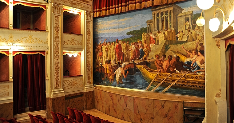 Besonders schön ist der Vorhang, der von demselben Maler stammt, signiert und datiert 1877. Das imposante Werk stellt den Kaiser Caligula dar, der dem Gott Clitunno Opfer darbringt.