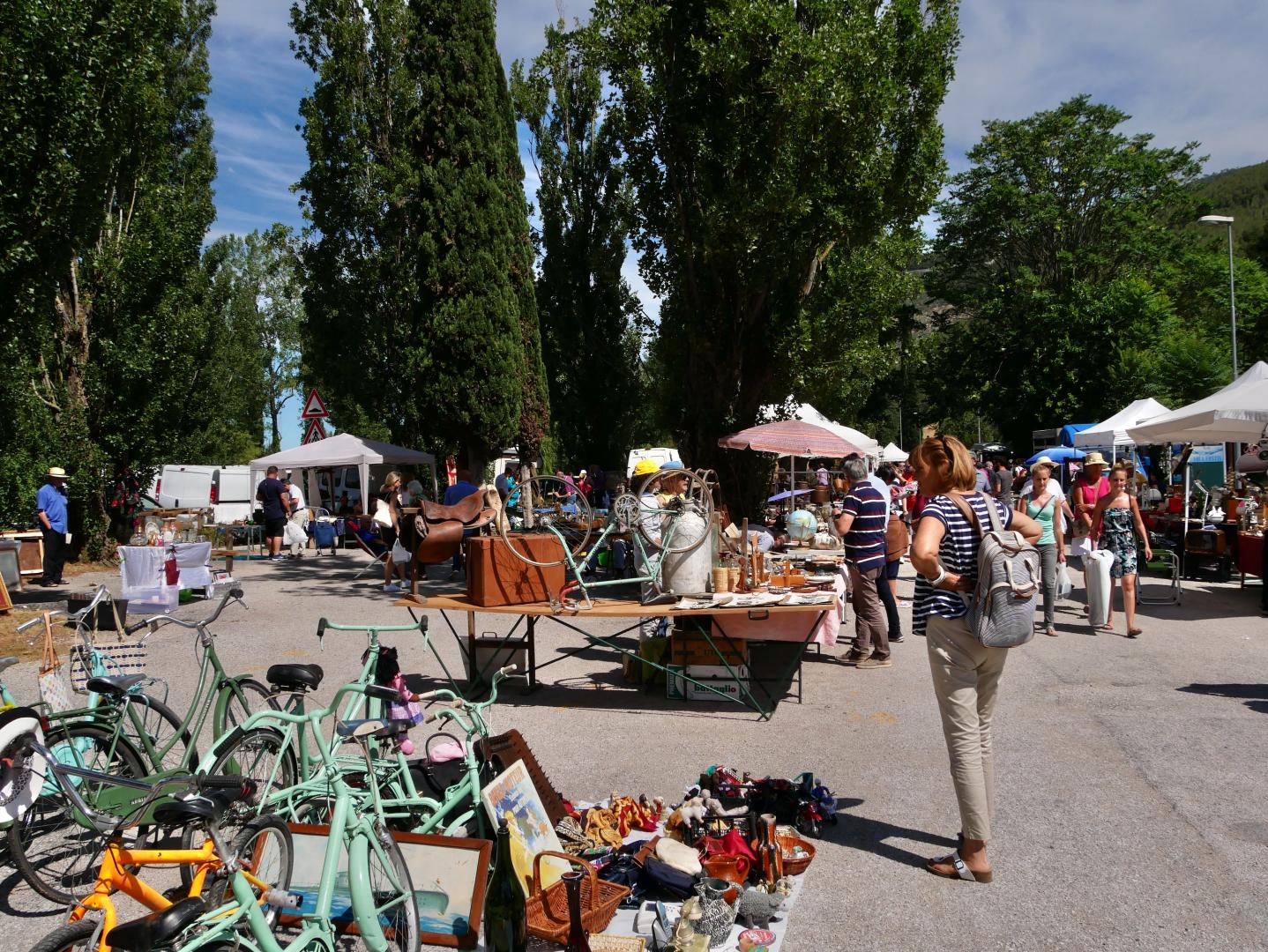 Stalls of an antique market with ceramics, vintage items and clothes displayed outdoors near the Fonti del Clitunno