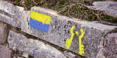 Along the paths of the hillside and valley floor, and also in the urban centres, there are also horizontal signs, consisting of two small bands of yellow and blue paint and a yellow tau.