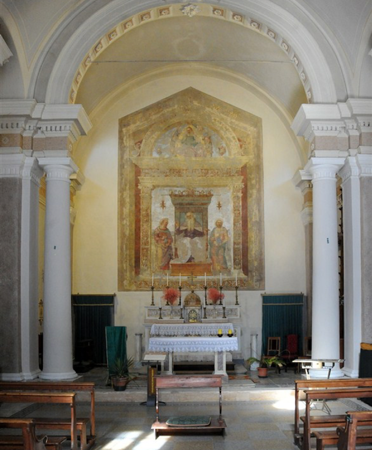 The interior is characterized by a cross-vaulted central bay between two narrow opening and closing bays of the hall, which are barrel-vaulted. The Society of the Disciplinati of the Holy Saviour is credited with a series of important interventions made in 1508 on the place of worship, including the commission to Pietro Vannucci, known as Perugino, of one of his last frescoes, Saint Anthony Abbot between Saints Paul the Hermit and Marcellus, located behind the high altar.