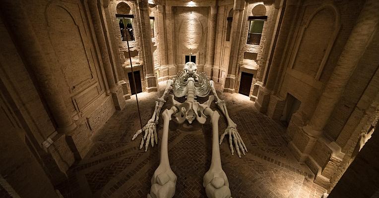 The "Cosmic Magnet" is a contemporary artwork by Gino de Dominicis. It's housed at the Italian Center of Contemporary Art inside the ancient Church of the Holy Trinity. It is a sculpture representing a monumental anthropomorphic skeleton, with the exception of a bird's beak in place of the nose.