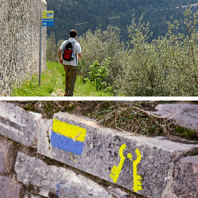 Sui sentieri di collina e di fondovalle, ma anche nei centri urbani, si trovano anche segnali di tipo orizzontale, cioè due piccole fasce di vernice gialla e blu e il tau giallo.